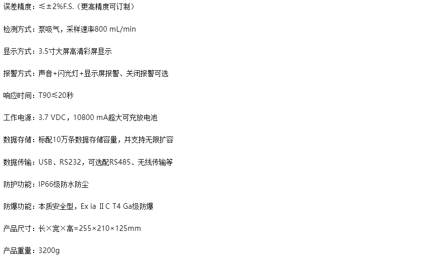 移動手提式惡臭氣體檢測儀為例,可以同時檢測并顯示GB14554中的全部8項惡臭污染物指標(biāo),并可選配PM2.5、風(fēng)速、溫度、PM10、噪聲、風(fēng)向、濕度、照度等檢測項目指標(biāo)。另外,該儀器配有10800 mA超大容量電池,可連續(xù)長時間進(jìn)行工作,具有IP66級防水防塵功能和Ex ia ⅡC T4 Ga級本質(zhì)安全型防爆功能,可適用于各種復(fù)雜工況場所中。